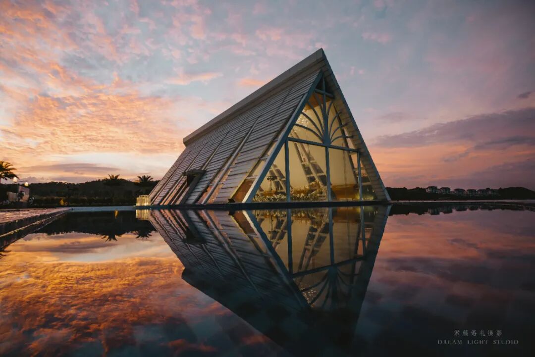 风之礼堂结合中西文化,以后现代主义简约风格为主基调,法式园林风格为辅,建筑风格上采用线条材质与通透玻璃相互辉映,室内宴会区和侧旁户外水台仪式区,在灯光渲染之下, 搭配着绿树葱郁,水榭兰亭,殿堂宴会区尤为亮眼。