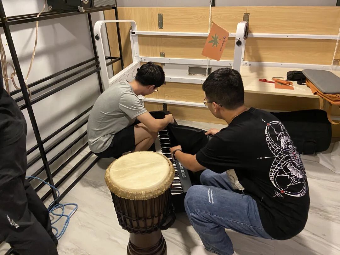 为了腾出更多的空间,正中央的大桌子放倒靠在墙边、墙边的合金柜子拆开安置在角落。捡了些羊毛毡布铺在地上,营造出舞台感,让大家一踏上布就有上台的感觉。成员们纷纷把乐器和设备搬过来,排练室就此诞生。