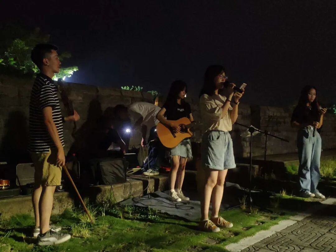 多巴胺在这个夏天一共进行了 5 场演出,相对于演出,他们更倾向于说是“音乐实验”,在不同的场所演奏。恒大城的 23sec 咖啡店门口、城墙上面的不插电巡回、初心咖啡馆门口的插电演出,每场音乐实验都吸引众多路人围观。