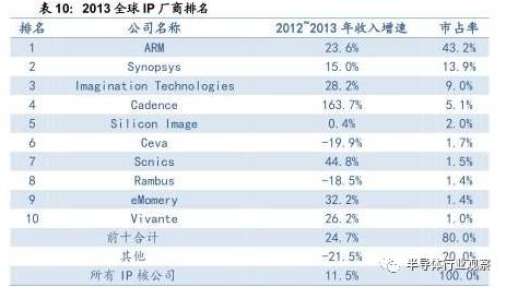 从2013年全球十大半导体IP供应商排行榜来看,66%的营收集中在全球前三大IP供应商处。其中ARM无庸置疑是全球IP核龙头企业,市占率为高达43.2%,而排名第二的Synopsys与排名第三的ImaginationTechnologies,市占率分别为13.9%与9%。