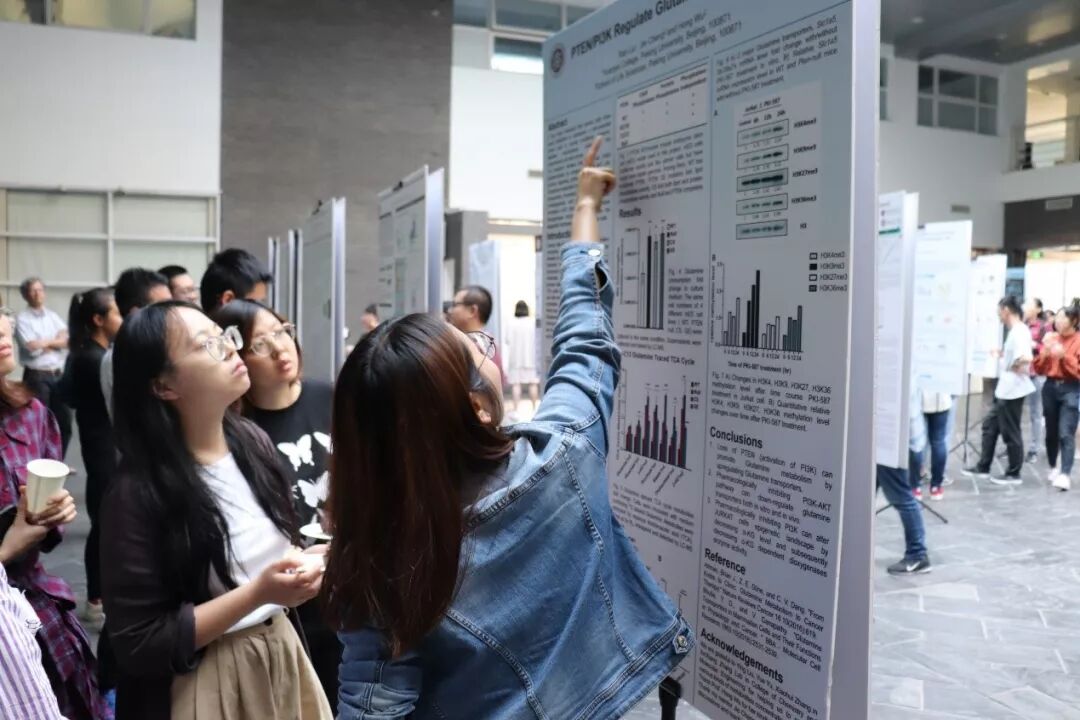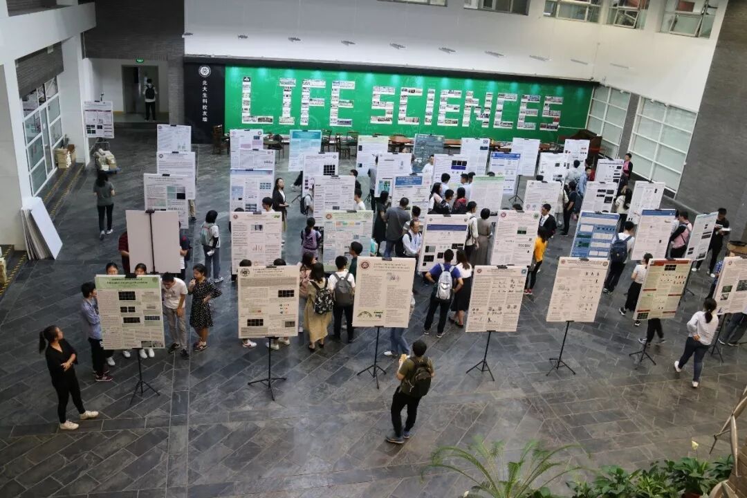 在2天的年会中,共安排了3场海报交流环节。每位参会的同学都要将自己的研究成果制作成海报,并在金光生命科学大楼1层的阳光大厅进行学术交流。参与海报展示环节的不仅有挑战班的同学,还有来自复旦大学和南开大学的优秀本科生们。同学们或是站在自己的海报旁介绍自己的研究工作、回答着观众的提问。或是围在他人的海报前认真聆听,交流结束后都对彼此的研究工作有了更深入的了解,更是跳脱出了自己实验室的主攻方向,探索了更大更广阔的生命科学世界。