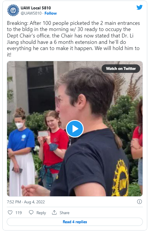 江丽的不幸遭遇在同事中传开后,引发了同齡同事的普遍同情,100多名同事自发举行抗议活动,最终加州大学圣地亚哥分校和江丽于上周五(8月12日)达成和解协议,允许江丽继续留在该校工作,并将其分配到另外一个实验室,保持她的签证有效,并保留她的健康保险等福利。这项和解协议是由江丽、加州大学圣地亚哥分校和美国国际汽车、航空航天和农业工具工人联合会 (UAW) 共同谈判达成的。![]()