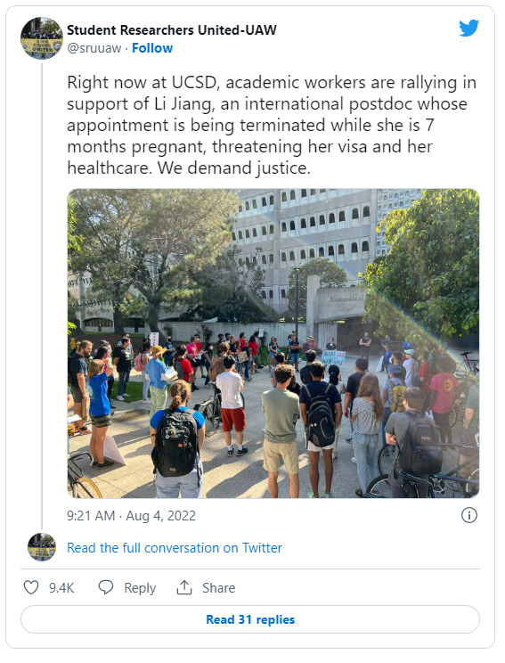 在加州大学圣地亚哥分校工作了四年多,多次续签工作合同的江女士在今年 1 月份表示,她曾质疑病理学系实验室的一些数据和研究方法的完整性,之后她的主管对她的态度就发生了显著变化。 江丽说,她的主管告诉她,她的工作合同不会再续签了,除非她“在短时间内能够提供某些数据”,可以使她的合同延长几个月。 “我非常努力地制作这些数据,并试图克服科学研究带来的所有障碍,尤其是在怀孕期间,但在短时间内这是不可能的,”江丽在给 NBC Asian America 的电子邮件中说。 根据和解协议,UAW 于 7 月 15 日代表江丽提出正式申诉,称她被解雇是违反了工会与大学的集体谈判协议,并要求重新与江丽续签合同。UAW表示,该协议目前正在工会和大学之间重新谈判,预计谈判将在秋季的某个时候结束。8 月 7 日,江丽已怀孕 7 个月,她的合同即将到期,这让她的签证马上就要随之失效。 ![]()