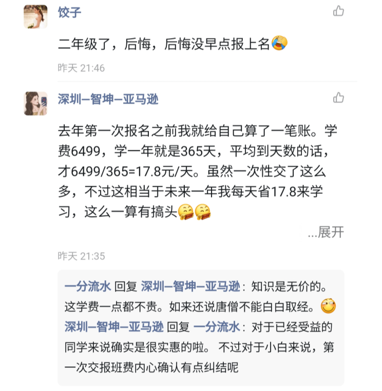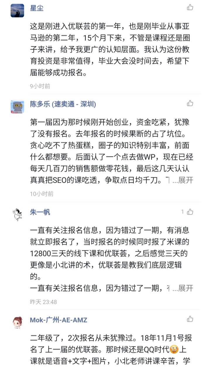 没有好的产品支撑,怎么可能有那么好的续费率,不是吗?对了已经有几百位同学已经报名了22届的优联荟了我们承诺在开课之后的一个礼拜内,如果你觉得不满意,可以无条件退款。这是我们对你的承诺,也是给你反悔的权利。所以到时候,你观察不是自己想要的,就退款,很简单。另外去年我们用了1.5天的时间,就停止报名了,并且叫人不要再继续报名。你用望远镜在跨境电商这个行业看下,没有任何一个人可以做到,这是我们的底气。
