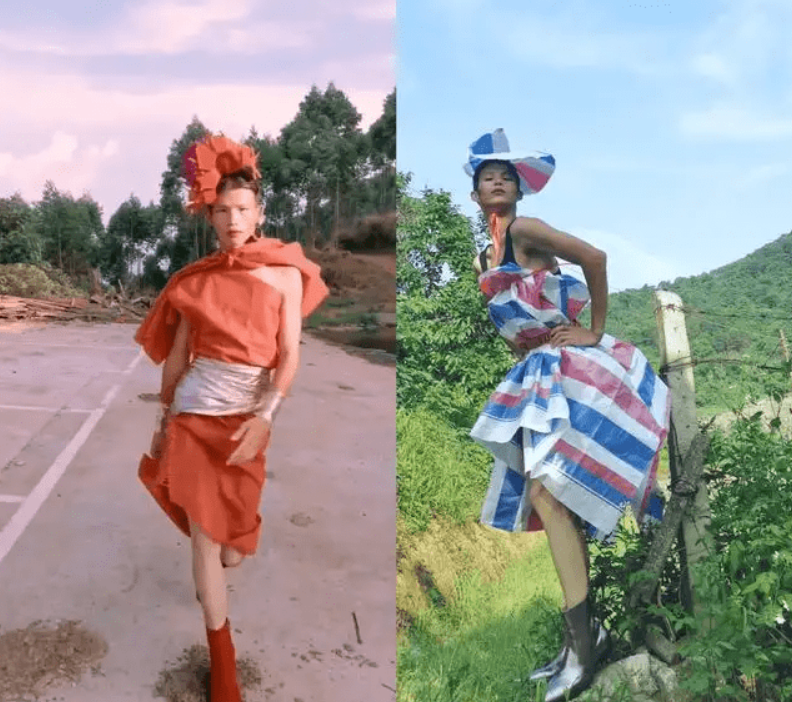 但这人觉得自己特别有时尚天赋,平常自己在乡下用垃圾袋、废弃渔网当衣服穿在身上走秀。