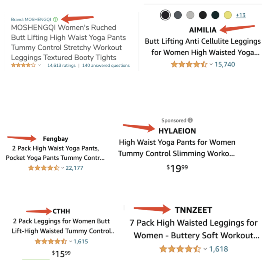 我只是随便搜了一个亚马逊红海类目-------瑜伽裤。如果有不慎无意分享到同学们的品牌,那我在这里说声抱歉先……这几个品牌大多销量很高,排名也都很高,因为我都是在第一页/第二页找的。