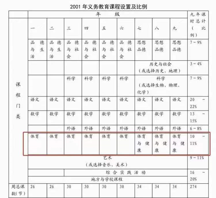 招考君在网上查到2001年版的“义务教育课程设置及比例”(如下图),可以清楚看出,20年前,体育课的九年课时总计(比例)就是10%-11%,而外语课是6%-8%。20年来,外语课时比例一直没有变化。