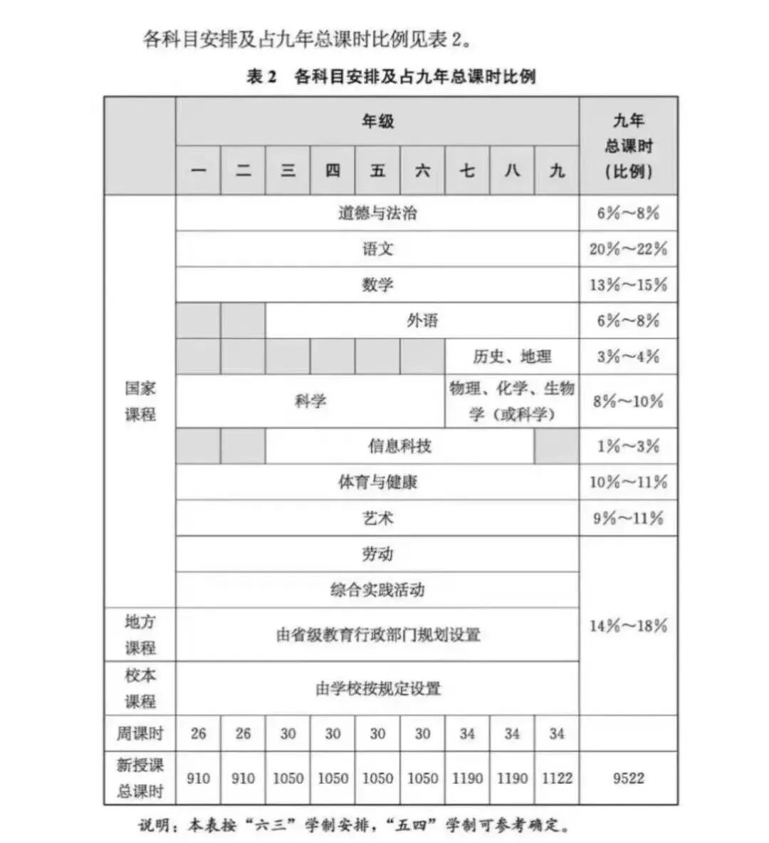 自媒体列举资料是:不久前,教育部印发义务教育课程方案和课程标准(2022年版),该标准将于2022年秋季学期开始执行。有人注意到新课标的课时比例表: