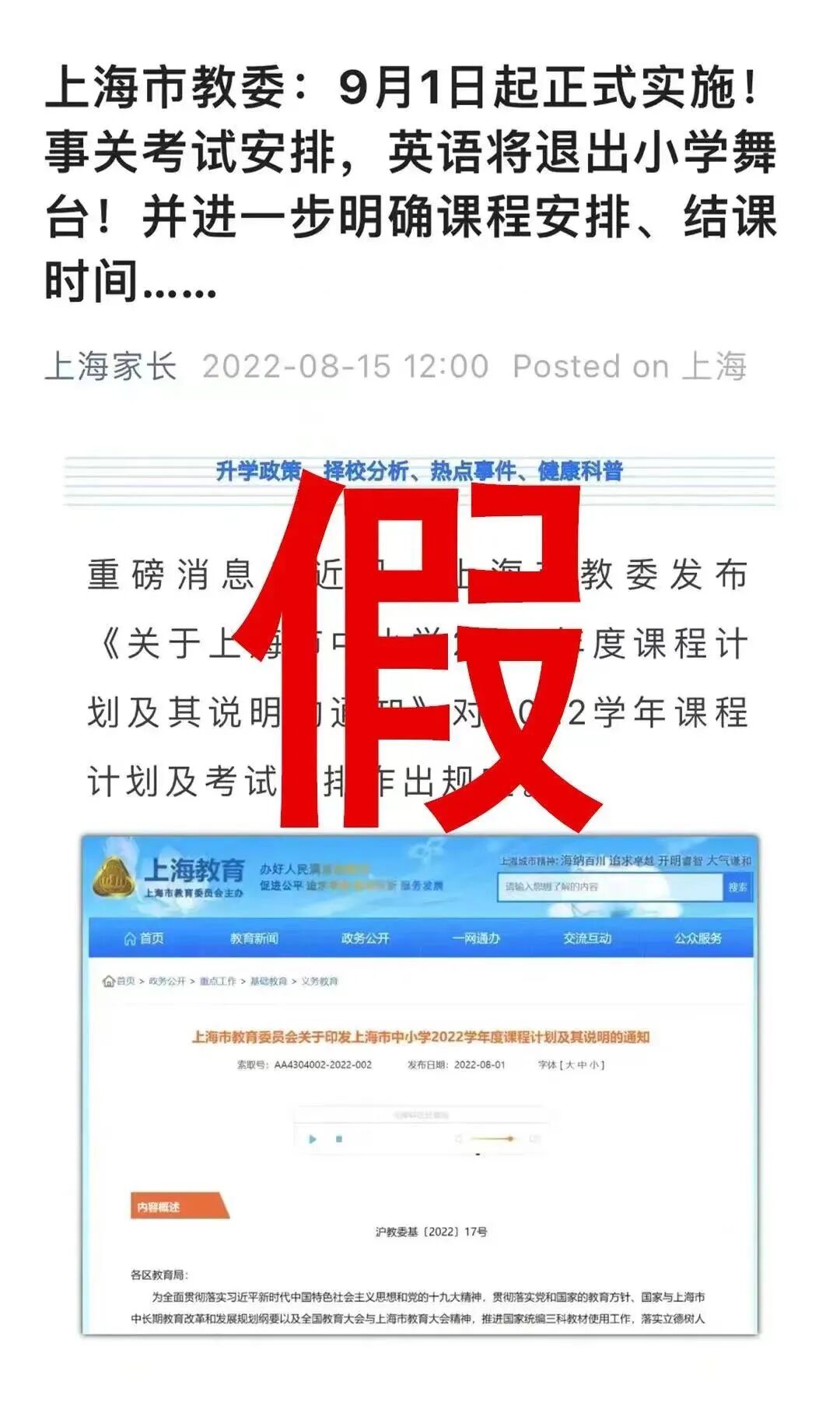 据上海辟谣平台的调查,近期“上海市教委称英语退出小学舞台”消息,较早是一家广告公司发布的,是对8月初上海市教委官网发布的《上海市教育委员会关于印发上海市中小学2022学年度课程计划及其说明的通知》的曲解。