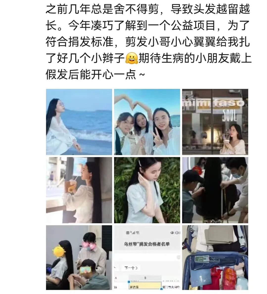 这里有个背景:市面上的假发大多都是用化纤制作的,但是,化疗的患者,特别是孩子不能接触化纤材料的人造假发,真人无烫染的头发才是他们可以使用的最好假发材料。