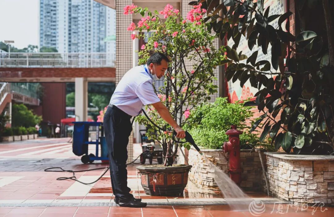 ▲学校开始大清洁大扫除,迎接学生到来。图为厦门五中校园。