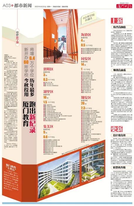 秋季开学,厦门将新开办60个学校项目(含改扩建项目),预计新增中小学幼儿园学位数6.4万个。