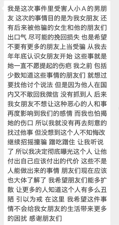 小A的现男友也出来表示,有人被骗财,有人被骗感情。他希望大家帮忙,让小Y能够接受法律的惩罚,也希望更多女生不要再上当受骗↓