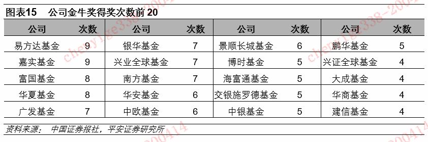 所有的金牛公司中,嘉实基金和易方达基金被评为金牛公司的次数最多,各9次;富国基金和华夏基金各8次。
