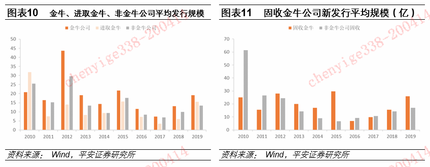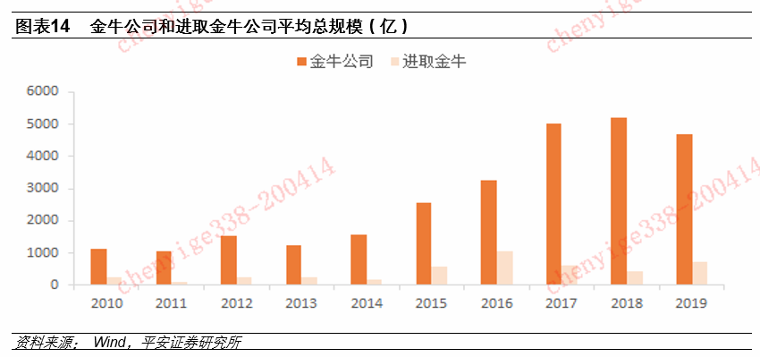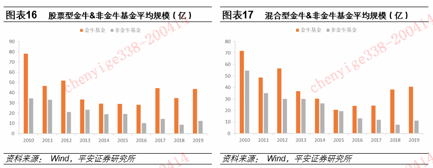 我们以最近10届公司金牛奖(2010年-2019年)为例,从公司平均总规模来看,除2010年,全部获奖金牛公司均大于非金牛公司,超越非金牛公司23%-233%不等。从平均新发行总规模来看,除2010年,金牛奖公司也均大于非金牛公司,超越非金牛公司25%-161%不等。