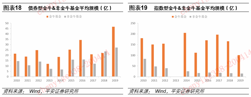 在2010年-2019年金牛奖中,金牛基金的总平均规模均高于非金牛基金。其中,股票型金牛基金规模为非金牛基金的1-4倍,混合型1-5倍,债券型1-3倍,指数型2-11倍。