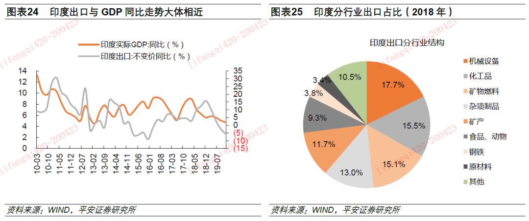 考虑到当前东亚疫情已基本可控,美欧疫情也进入平台期,东盟与中东疫情虽较为严峻,但内部分化,且伊朗、马来西亚等此前疫情较为严峻的经济体的疫情也开始出现新增拐点。加上印度的主要贸易方均处于北半球,各大贸易伙伴的疫情有望在6-8月得到控制。