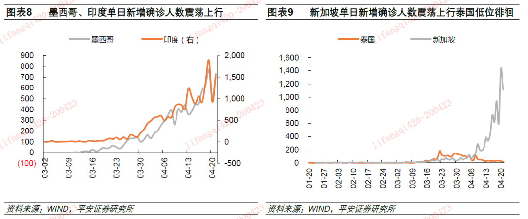 整体来看,东盟中的越南防疫工作非常出色,新增病例已降至个例;泰国防疫也效果显著,疫情基本可控;马来西亚疫情也处于相对稳定的状态。虽然新加坡尚未出现新增拐点,但在丰富医疗资源支撑之下,疫情尚且可控。但是,墨西哥、印尼的疫情不仅严峻,且防疫力度有待进一步加强;印度虽然加强了疫情防控,但开启时点较晚叠加薄弱的社会、民生基础与较差的卫生、医疗设施,印度的疫情发展仍具有较大变数与风险。