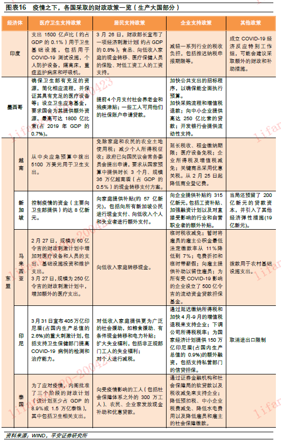截至4月20日,各生产大国的财政政策均以扩张性刺激为主要方向,但力度差异较大。泰国、新加坡、印尼、印度与马来西亚财政刺激额度均超过200亿美元,而墨西哥与越南财政刺激额度小于100亿美元。从财政刺激额度及GDP比重看,新加坡、泰国、马来西亚三国最高,印尼也超过2.5%,印度、墨西哥、越南则低于1%,其中越南仅为0.5%,这与越南抗疫效果较好有很大关系;整体看,墨西哥与印度的疫情严峻而财政刺激力度较轻,财政支持仍有继续加码的空间。