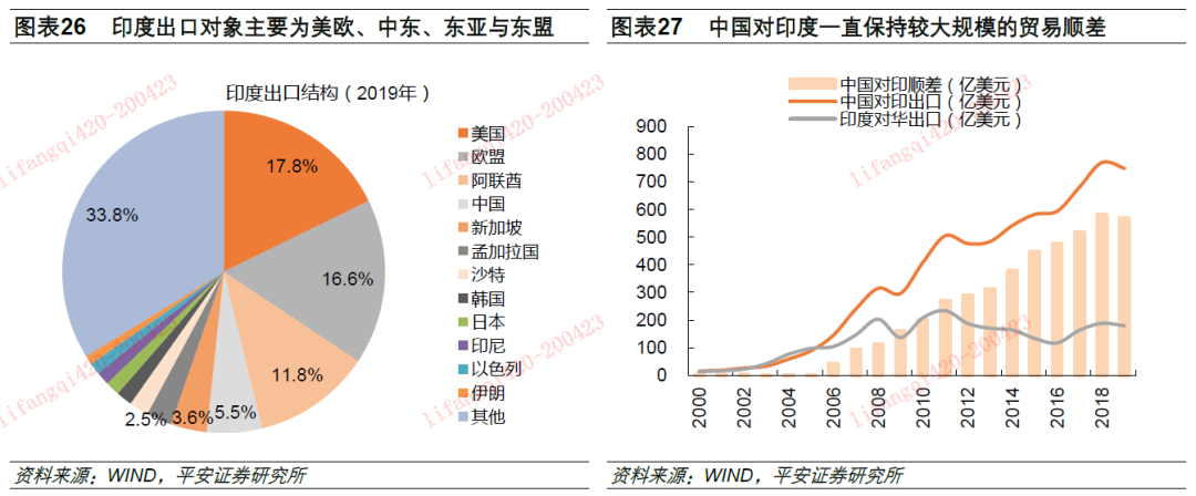 从需求结构看,印度经济是消费驱动,且净出口对GDP贡献为负;从产业结构看,印度是服务业为主导产业的经济体,同时制造业与农业对经济的贡献也很显著;农业增加值占比超过13%,制造业、建筑、采矿、公用事业等第二产业增加值占比超过27%,服务业增加值接近60%;这表明印度是基于产业结构相对均衡的经济体。印度的净出口对经济负贡献的原因就在于其既拥有高额的出口,也有着很高的进口,两者相减导致净出口占经济比重较低。