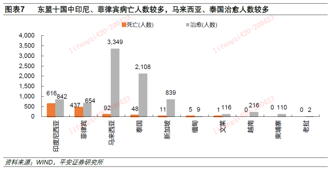 分国别看,东盟十国中印尼、菲律宾、新加坡、马来西亚疫情较为严峻,其中印尼累计确诊人数第二多,仅次于新加坡,已超过7100,病死率高达8.6%;菲律宾累计确诊人数超过6500,病死率高达6.6%;新加坡累计确诊人数超过9100,病死率为0.1%;马来西亚累计确诊人数超过5400,病死率达1.7%;除了上述四国之外,东盟其他经济体疫情相对较轻。其中,泰国累计确诊超过2800人,病死率为1.7%;而越南、文莱、柬埔寨、缅甸、老挝的累计病例数较少,均不足 300人,且除缅甸外,其余四国单日新增病例数仅为个例,且病死人数均为1或0,而缅甸病死5人,由于累计确诊病例共121人,所以病死率达到4.1%的水平。