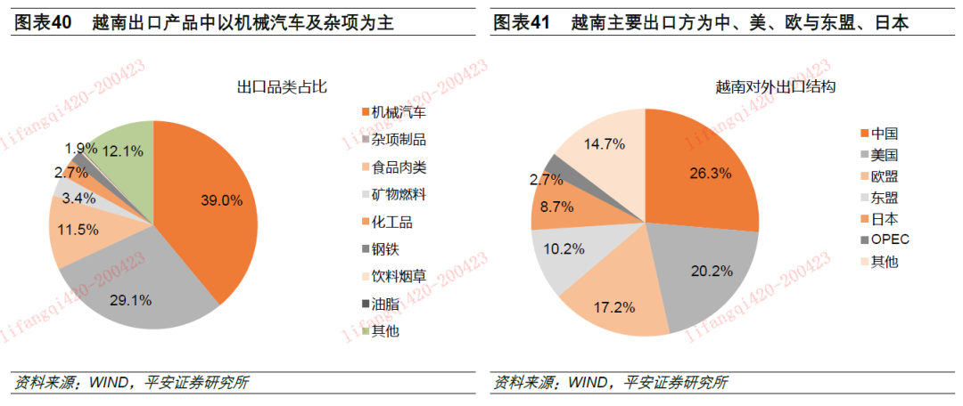 可以发现越南的出口增速与其经济实际增速有着一定的正相关性,但越南对华出口与越南GDP同比的关联度更高,这说明出口(特别是对华出口)是越南经济的主要驱动力。从出口结构看,越南的机械、汽车产品比重为39%,杂项制品占比为29%,食品与肉类占比超过11%,剩余品类占比较低。越南的第一出口方为中国,对华出口占其总出口比重超过26%,对美出口占比超过20%,对欧出口占比超过17%,对东盟内部的出口占比分别为10.2%,对日出口占比为8.7%,剩余经济体并非越南的主要贸易方。