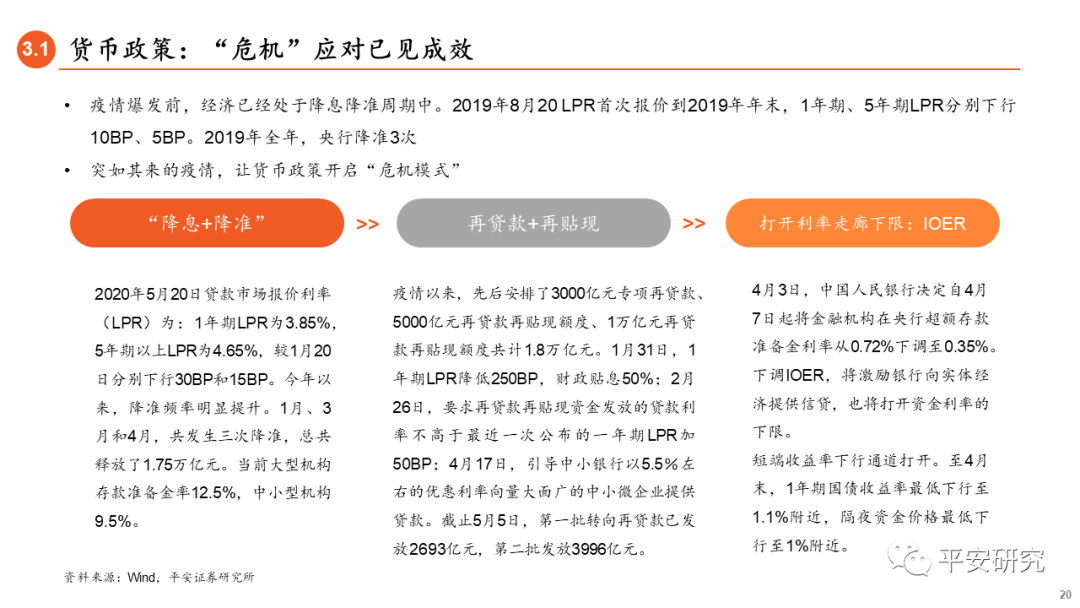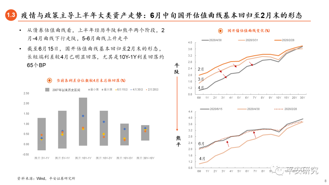 【大类资产】2020年上半年大类资产价格跟随疫情发酵和政策对冲两条主线波动,经历国内疫情-欧美疫情-新兴市场疫情三个扩散阶段。 国内债市走势总体分为两个阶段,第一阶段(2-4月)债市强劲走牛,基本面、政策面和资金面对债市均较为友好;第二阶段(5-6月),资金面承压,货币政策进入观察期,但6月以来疫情二次爆发风险和经济修复偏缓对债市形成弱势利好。【经济基本面】下半年经济在“政策对冲+内生修复+外需好转”三重共振下渐进式修复,三四季度GDP增速持续回升,全年增速可能在2%-3%的区间。从供给看,前期生产由积压需求和基建拉动,近期回升边际放缓,下半年将由内外需共同修复带动。从需求看,基建托底的主线逻辑不改,制造业受企业盈利承压制约,外需将在三季度明显修复,消费回升受制于收入与就业。年内物价总体维持通缩,不会对货币政策形成掣肘。【经济政策】货币政策当前已经从“应急”阶段过渡到“宽信用”阶段。央行对流动性仍将以呵护为主,通过“以量调价”,抚平资金面的波动。降息或难以再现,金融向实体经济让利。为获得息差空间,银行主动下调负债成本变得迫切。资金收益下行,倒逼风险偏好抬升,助力宽信用。疫情影响下,财政支出力度强于往年,更加侧重地方,下半年支出有有望加速。仍需观察财政收入增速情况是否会对支出形成制约。【利率债走势】全球经济复苏共振是下半年利率债走势的主逻辑。疫情影响经济修复上限,收益率上行有顶。全球经济处于修复阶段,收益率下行有底,下半年10年国债震荡区间为2.6%-3.1%。三季度,经济基本面回暖消息集中确认,将会带动收益率迅速调整。同时,当前市场缺少配置盘,这也将加剧市场波动幅度。四季度,消息面扰动减少,收益率窄幅波动。下半年依然存在博弈机会, “疫情”“外需”以及“中美关系”都会带来短期交易窗口。下半年预期差或来自全球央行的货币政策,即政策是否会随着经济向好而提前转向。