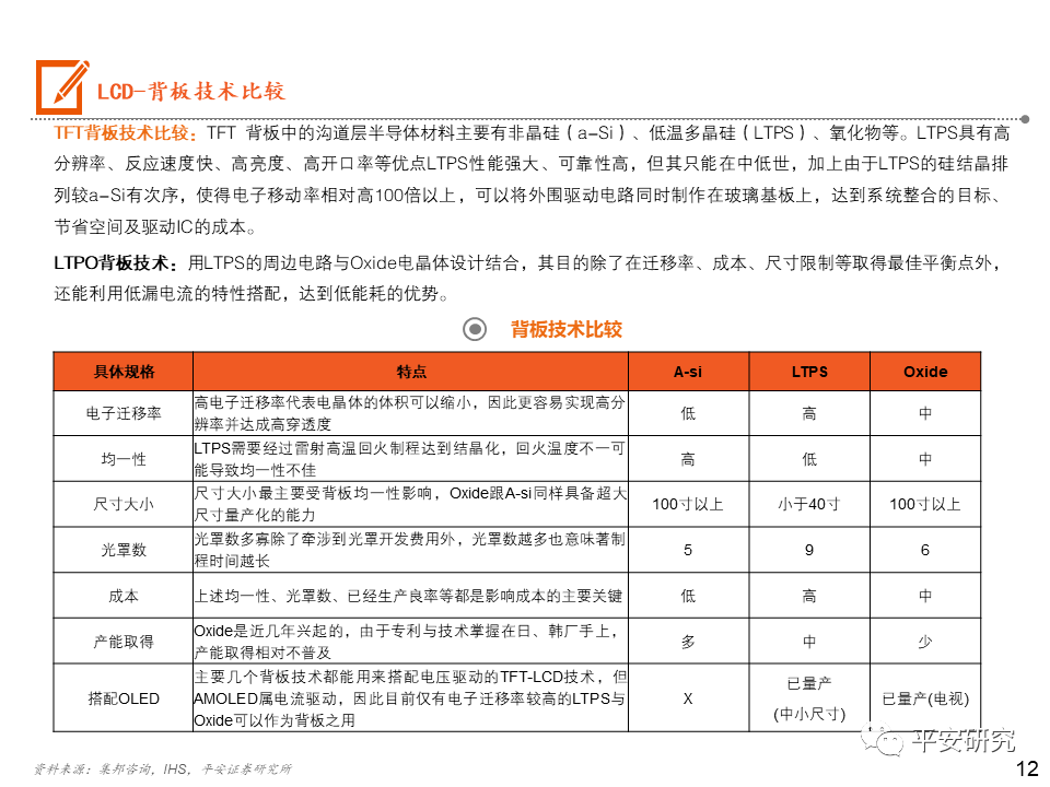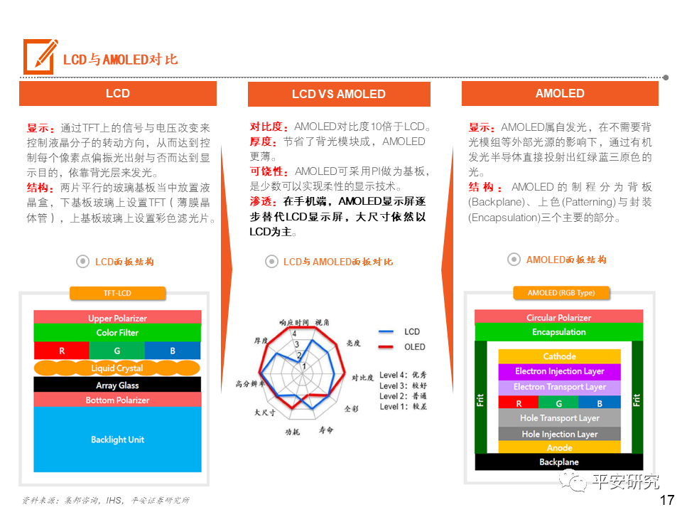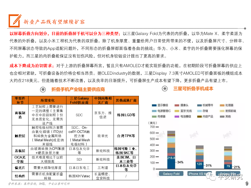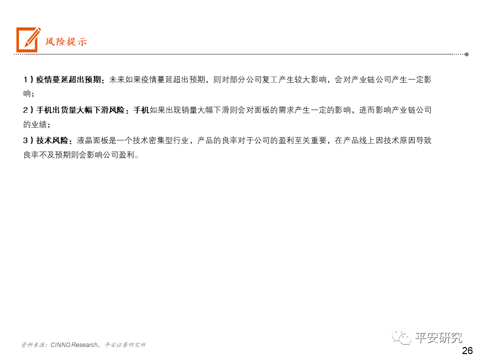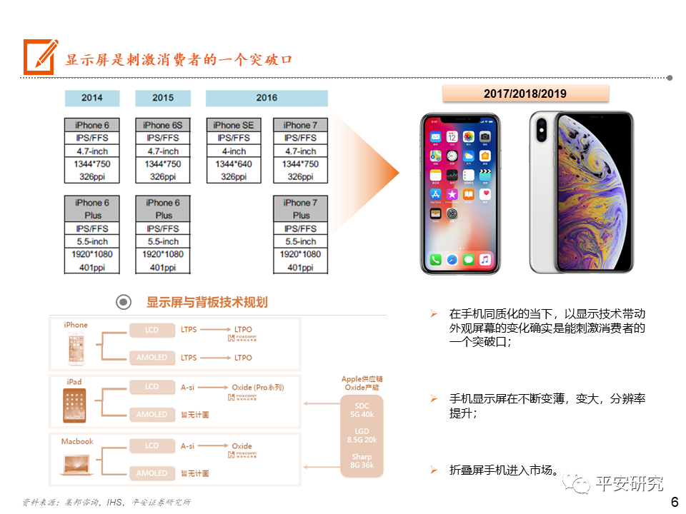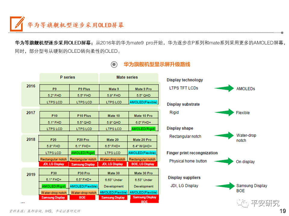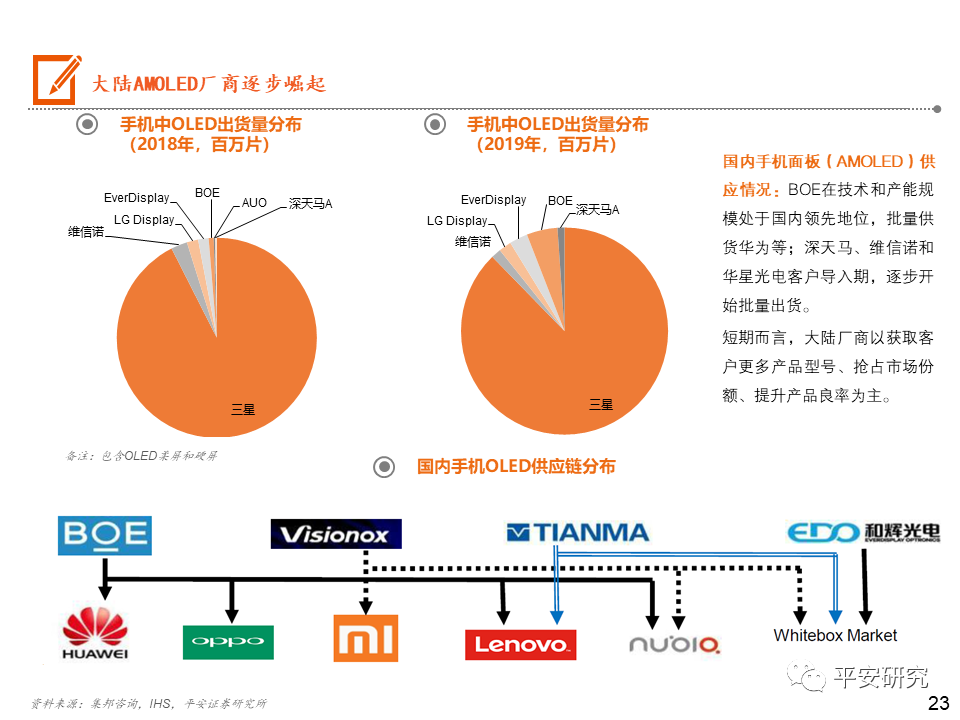 日韩厂商逐步退出小尺寸LCD市场,大陆厂商占据主导:在手机LCD的屏幕供应链体系中,Sharp、JDI主要供应苹果手机,在苹果手机转向AMOLED后,且日韩企业在人力成本等费用较高,Sharp和JDI逐步减少投片量,不断缩减规模。目前JDI多次传出对外售卖的讯息,预计未来将逐步被兼并整合。大陆厂商以深 天马A、华星光电和京东方A为代表,贴近下游客户,逐步在市场上占据主导地位。OLED三星领先,大陆厂商逐步崛起:苹果的AMOLED短期内将受限于三星的供应,但苹果除了积极与LG合作外,还与LGD、京东方等密切接触,尝试AMOLED供应的分散化。京东方也在积极投产AMOLED产线,未来也有机会成为苹果的供应商。2020年中国大陆厂商深 天马(武汉二期)、维信 诺(固安)、华星光电(T4产线)、京东方(绵阳和成都二期)OLED产能逐步开出,国内厂商OLED市场份额占比有望逐步提升。投资建议:一方面:在手机同质化的当下,以显示技术带动外观屏幕的变化确实是能刺激消费者的一个突破口。屏幕的尺寸越来越大,而且越来越薄。另一方面:18:9/19:9显示屏的显示屏快速渗透,催生出挖孔屏、刘海屏、屏下指纹的诞生,以及未来可能上市的屏下摄像头,而分辨率的提升比较明显的则是OLED显示的使用。风险提示:1)疫情蔓延超出预期;2)手机出货量大幅下滑风险;3)技术风险。