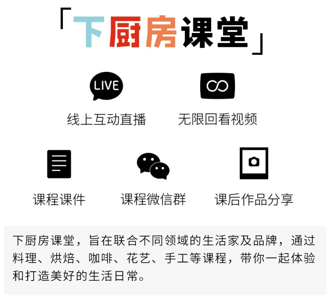 「下厨房课堂」,是下厨房推出的课堂品牌。 旨在联合不同领域的生活家及品牌,通过料理、烘焙、咖啡、花艺、手工等课程,带你一起体验和打造美好生活日常。