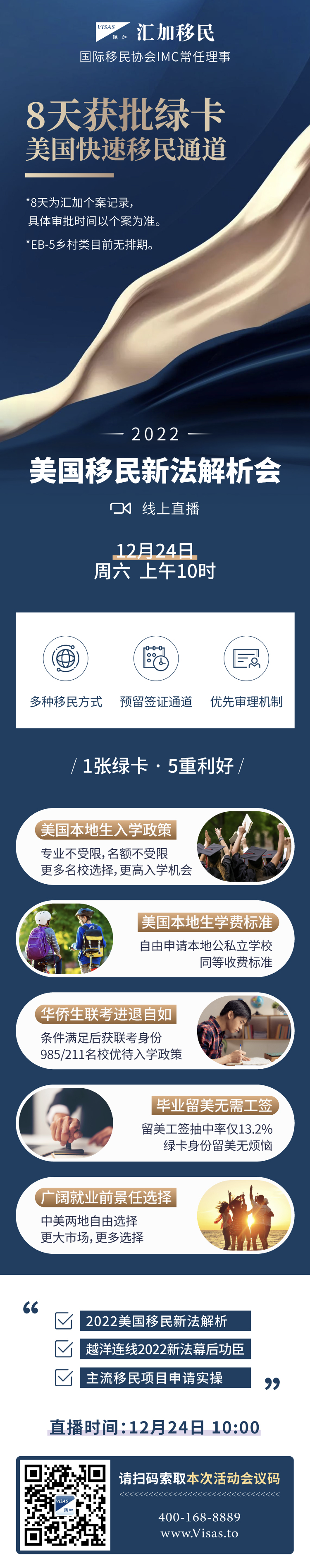 北京时间12月24日,本周六上午10时,业内享有盛誉的移民机构—汇加顾问集团(Visas Consulting Group),携手美国国务院签证办公室前主任Oppenheim阁下和前美国移民律师协会主席Wolfsdorf大律师,在线解读2022美国移民新法,这是您了解美国移民和签证政策的一次良机。您可以添加客服微信索取会议码 或 扫描下方海报上的二维码直接预约。