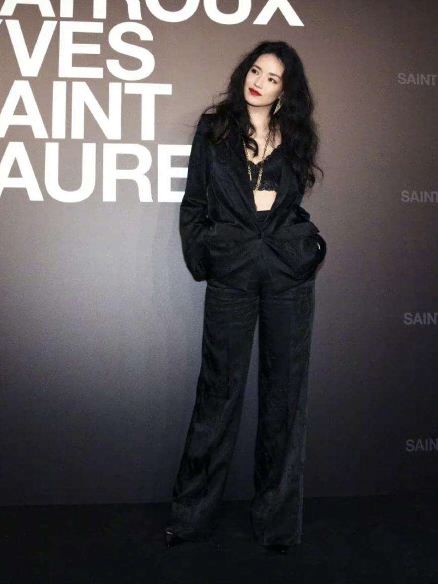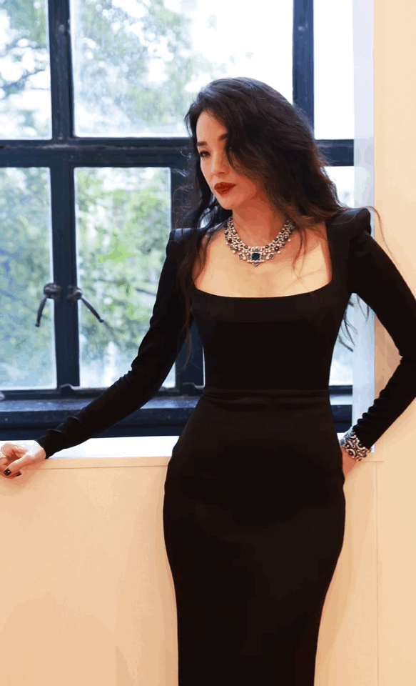 一条黑色的紧身长裙、大波浪、大红唇,美得不费吹灰之力,舒展大气又明艳。