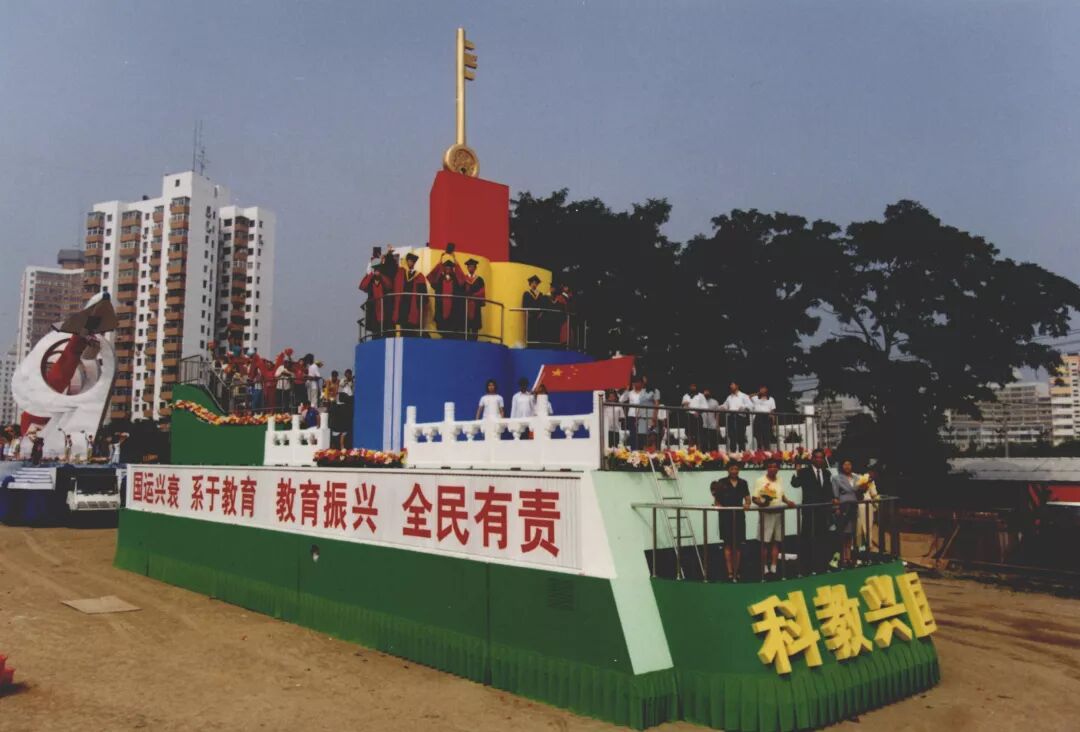 清华和当时的工艺美院为国庆50周年庆典联合设计、制作的“科教兴国”超大型彩车