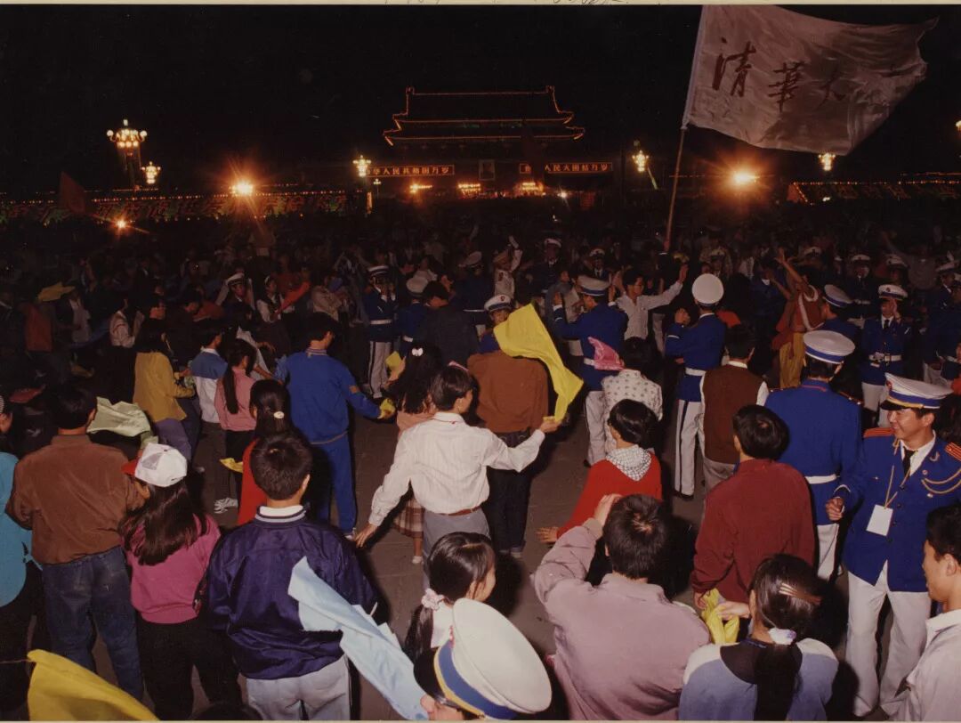 新中国成立35周年时,清华同学方阵走过天安门广场的情景