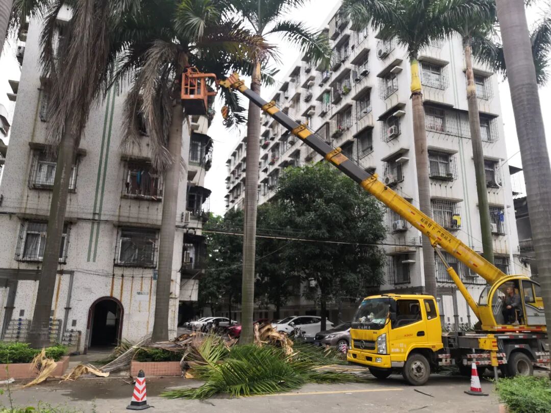 据了解,甘化新邨牌坊后的道路两旁以及部分居民楼侧种植了大量大王椰子树,树叶干枯掉落的情况时有发生,其树叶大且重,修剪枝叶工程量较为复杂,该社区发函请该局协调处理。