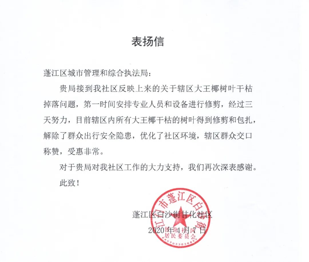 近日,蓬江区城市管理和综合执法局收到了一封来自甘化社区的表扬信,感谢该局在抗击新冠肺炎疫情的同时,高效率、真心实意为群众办实事、解难事。