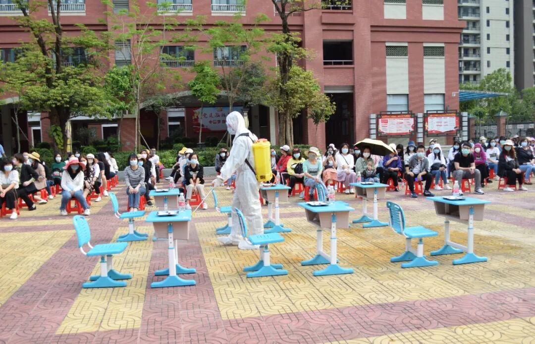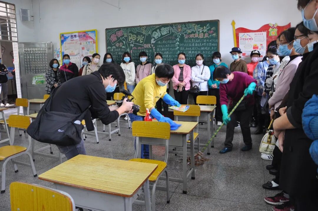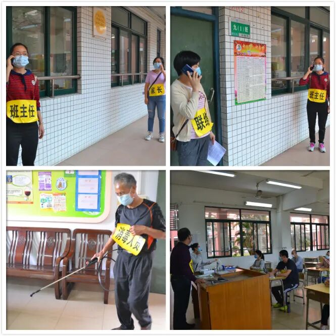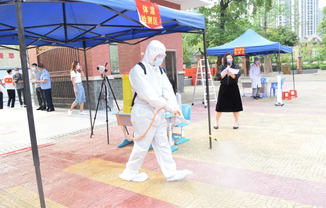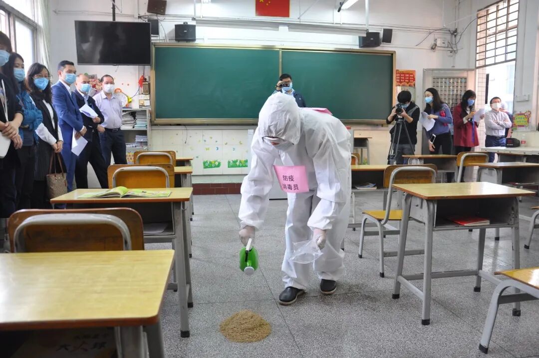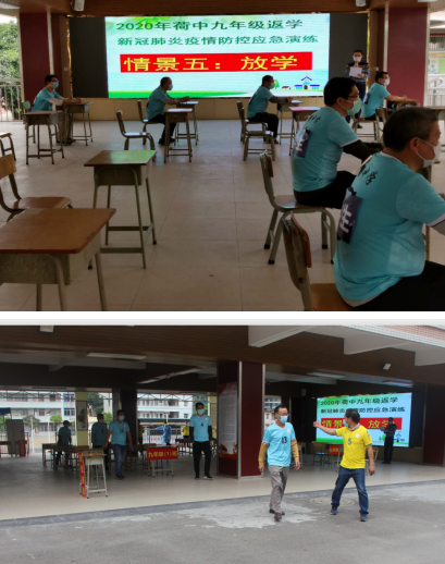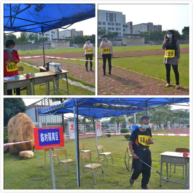 应急演练设置了师生进校晨检、课室上课出现发热、学生出现呕吐共三个场景。每个情景均按照制定的应急预案,进行校内应急处置、疫情上报、专业消杀等应急处置流程,涉及值班老师和学校领导、上课老师、班主任、家长等。每个模拟情景,老师们都认真对待和做好,流程紧凑而严肃,为全面复课后教育教学活动作了良好的防疫卫生工作指引。
