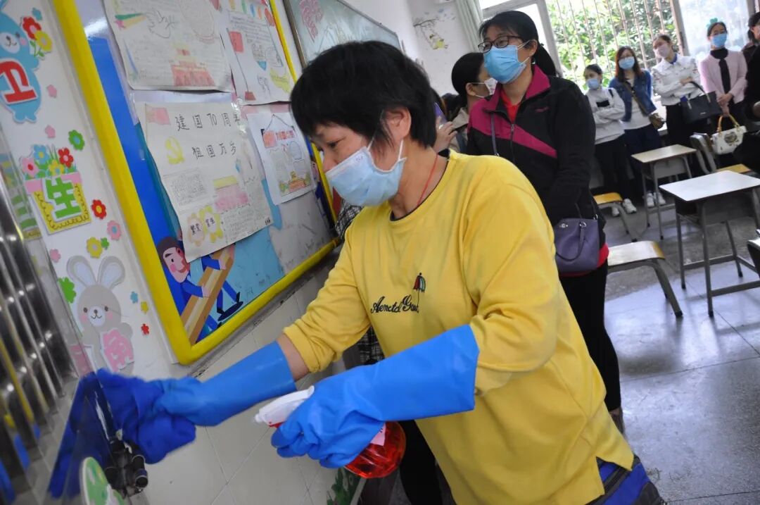 工作人员对校门口进行消杀。