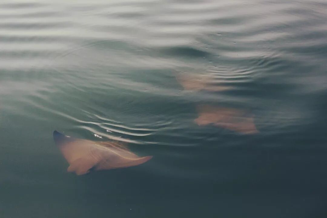 我有幸在马尔代夫见过一次蝠鲼的社交性进食。五只悠然的蝠鲼,围着我们的小船,排成了一个圆环。时而聚拢,时而分开,就像一朵开在海上的紫荆花,时而含苞,时而绽放。