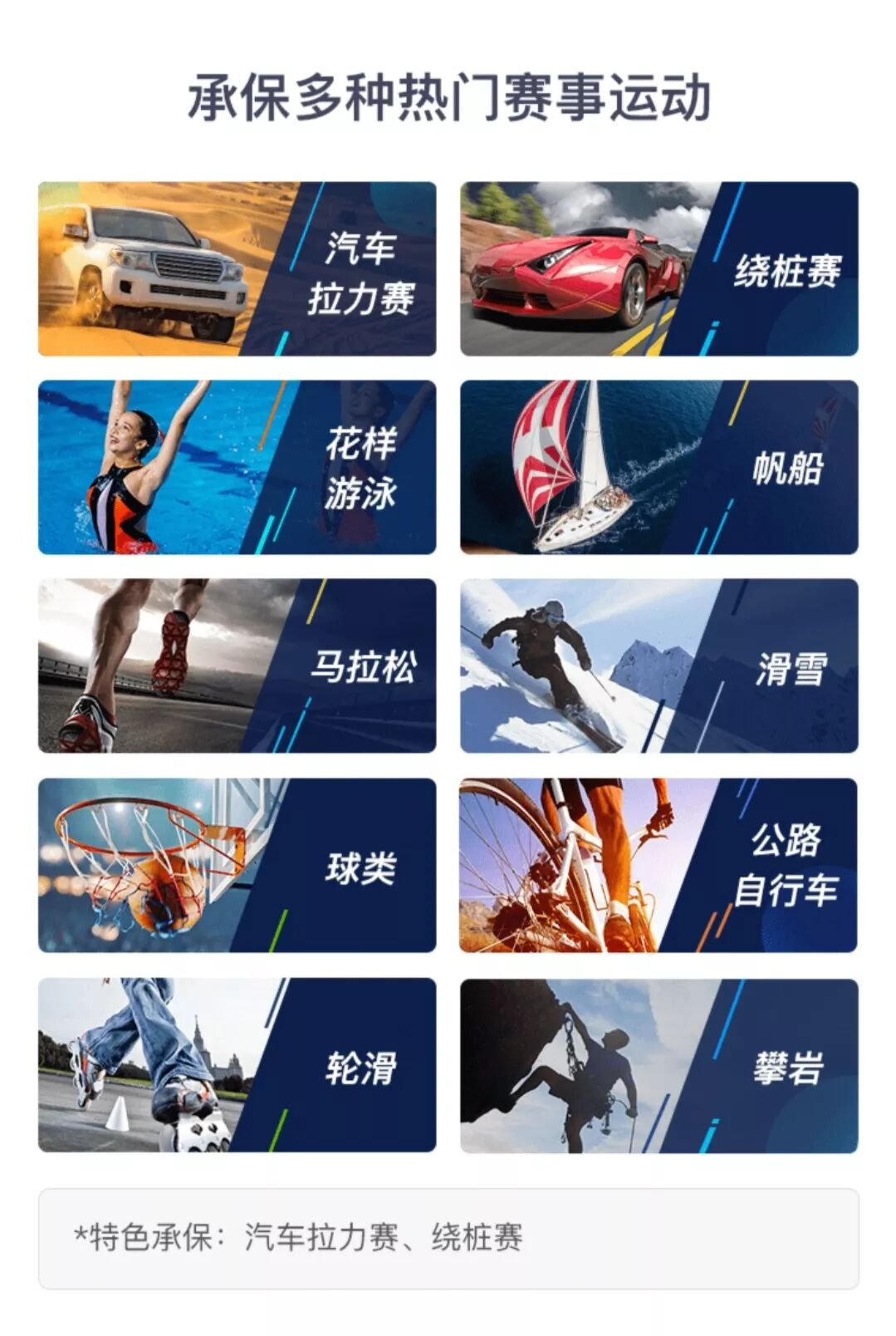 我们推荐阳光赛事保障计划。从常规的马拉松越野跑到特色承保汽车拉力赛、绕桩赛,从花式游泳到帆船等水上运动到公路自行车、攀岩、滑雪等众多项目应有尽有。