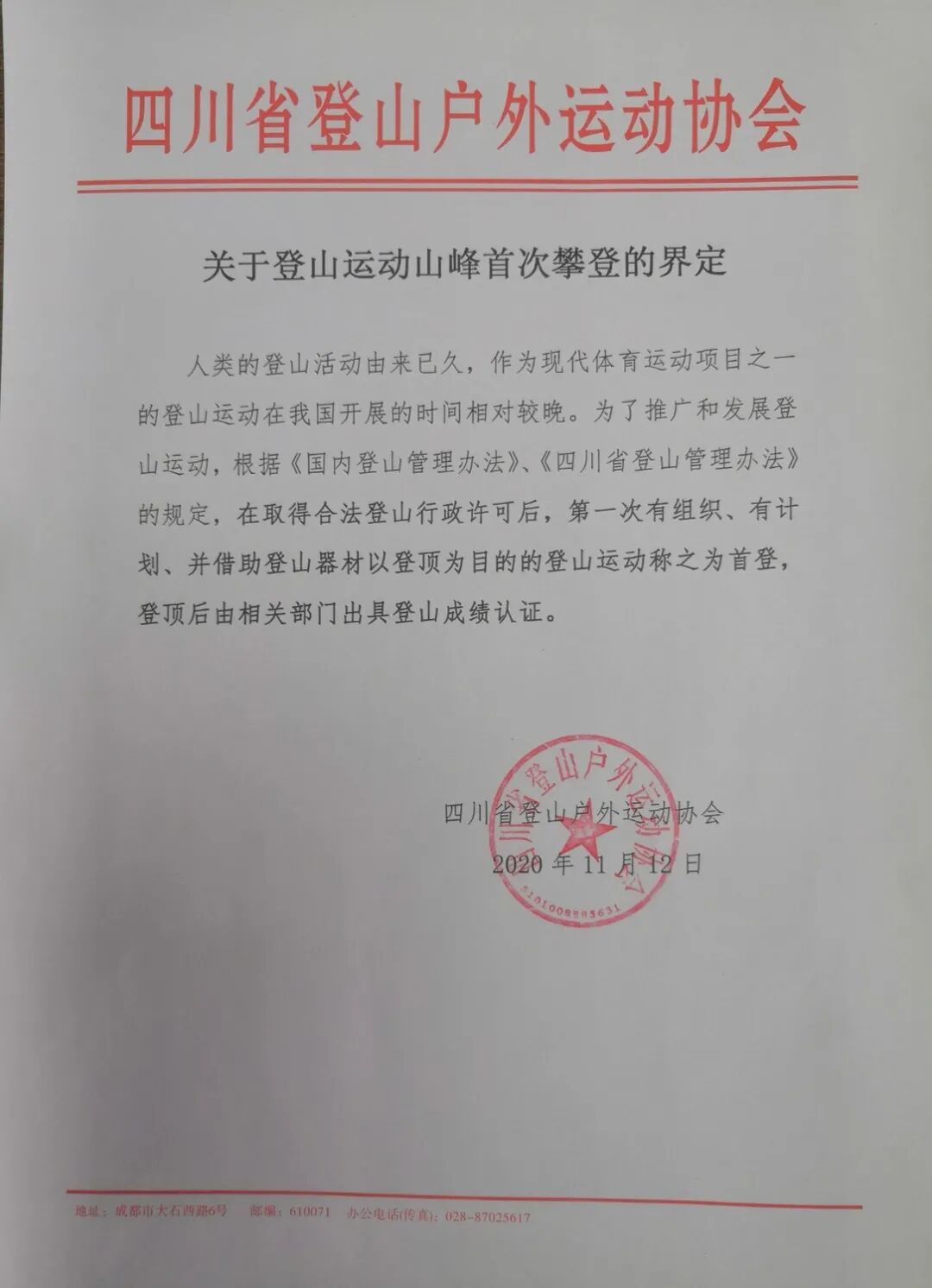 川登协的这篇公告更像是一纸檄文,将四川山峰的“首登”彻底割裂成两种情况:合法的首登,以及事实上的首登。