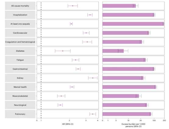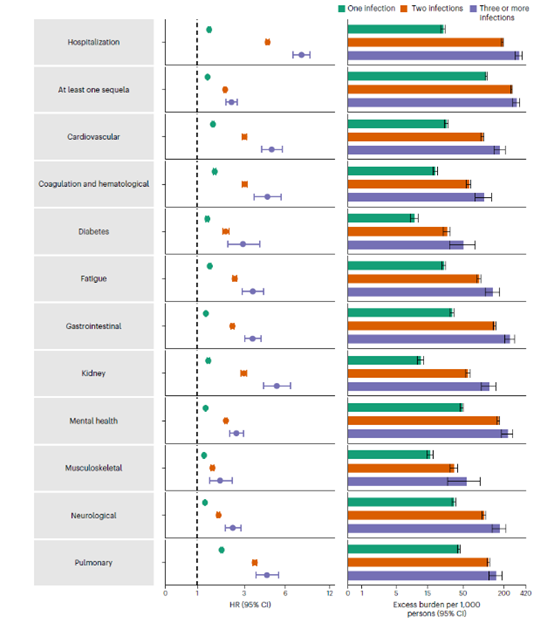 与没有再感染的患者相比,再感染患者的后遗症风险增加,如肺部后遗症,包括心血管疾病在内的几种肺外器官系统后遗症、凝血和血液疾病、疲劳、胃肠道疾病;肾脏疾病;精神健康障碍 、糖尿病、肌肉骨骼疾病和神经系统疾病。