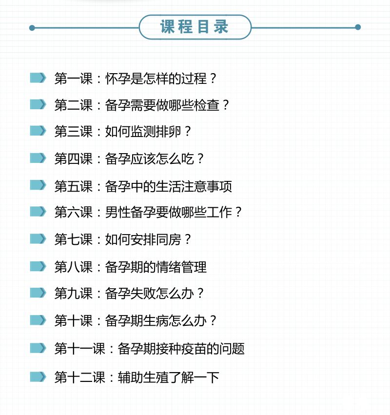 精心准备了12节视频课程,由老六亲自讲授,内容涵盖备孕期需要了解和注意的所有问题,包括怀孕的流程、备孕检查、情绪调整、先生的准备、辅助生殖等12个大课共包含60多个小节。每节课20分钟左右纯干货内容。让你和你的另一半可以对备孕整个过程有个清晰准确的认识。