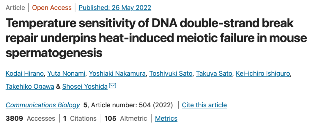 来自日本国立基础生物学研究所的研究人员在Nature子刊《Communications Biology》上发表了这篇题为《Temperature sensitivity of DNA double-strand break repair underpins heat-induced meiotic failure in mouse spermatogenesis》的研究论文。