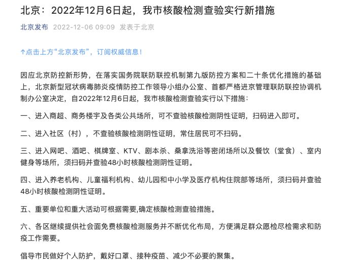 也就是在周二,北京核酸查验实施了新措施,进入商超、办公楼等公共场所不再查验核酸。