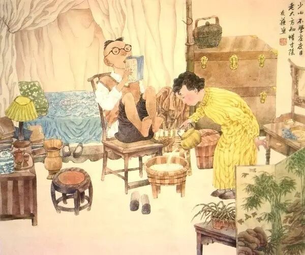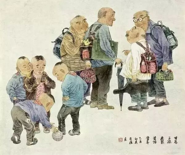 祖父年迈,儿子尽孝,其乐融融。