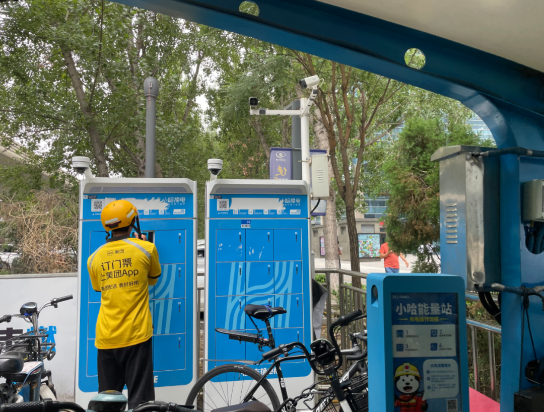 在休息区外是非机动车停放区,配有小哈换电柜。停车、取电池、扫码、将电池放入换电柜、点击手机页面,从另外一个开启箱门中取出满电的电池……不到一分钟,一名外卖员就完成了换电流程,重新骑上电动车,奔赴下一单外卖的收货地址。
