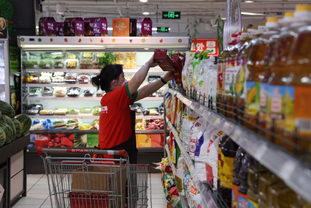 该超市覆盖了周边多个小区的日常供应。为了落实好疫情期间的保供工作,超市备货量达到了平时的1.5倍,并打通供货渠道,随时做好补充库存的准备。