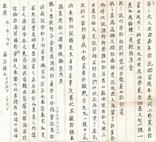 去年你说回家过年,我同小於菟自封篆日起,天天盼望。至元旦夜,我尚梦见你回来,又起二课,一是午马归槽,一是恶狗得食。妈妈说,也许你初间到家,以去腊袁世凯倒灶,妈妈甚为高兴,又因你南归度岁,故在上海买了许多食物,所以说课到对景。谁知你没有口福吃。现在你又说三月来,恐怕又是说到办不到。我们也就不再傻望了。高先生初七始到,单教小於菟,束修拟照方先生一样,十二元,尚未对他说。杨先生自得差事后甚忙,不能按课来讲矣。我初二开笔做论,意思是妈妈告我,句子全是我做的,你看好不好?据实说来(此语是学你的,勿怪),你前函说带松子肉、蛋黄酥,至今宗子立未寄来,不知是否失落?望查明见告。涵舅之病并未好,而其家人均讳言之,涵舅母亦不见感谢我处。据云渠屡次催涵舅写信给你,涵舅亦懒于动笔,因之未果。大约春间尚无碍也。敬颂春祺。
