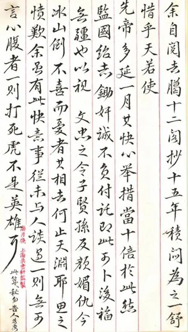 别来倏已兼旬,我与毛弟无日不念兄也。腊八将至,因念你最爱腊八粥,不知在都有得吃否?杨先生已来过三次,每次讲《古文观止》论一篇,甚夸我悟性好,方先生廿六到馆,教我读书。高先生教毛弟读。现已十日。我将以前顽皮坏样全改了。午间不到十二点钟就放学,晚间不到五点钟放学。回来或看火车,或上花园,甚觉畅快,妈妈喜欢得很,勉我长此不懈,自能有进益。遂命我写信告你,想你也必喜欢也。