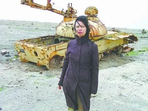 张翠容在伊拉克采访,身后是废弃的美军坦克。